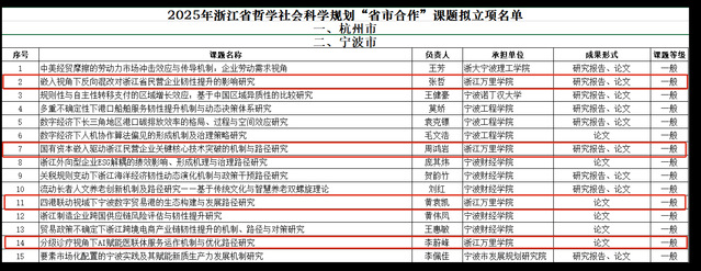 9月12日,浙江省哲学社会科学规划办公室公布了2025年浙江省哲学社会科学规划“省市合作”课题立项名单。公司张哲、周鸿岩、黄袁凯、李蔚峰四位老师申报的课题获得一般项目立项。