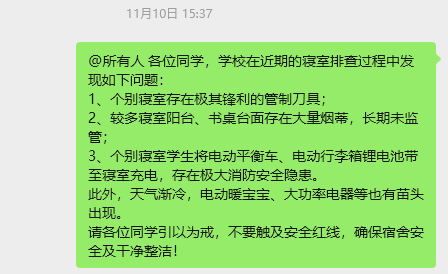 为保证师生日常安全,本月公司各班班主任、辅导员及安全员聚焦实验室、宿舍、办公区域及公共空间进行例行安全检查。对过程中发现的风险点建立台账,立行立改,明确责任人与整改时限,形成管理闭环。检查结果总体情况较好,没有发现严重的安全隐患。此次排查有效消除了潜在风险,提升了物防技防水平,从源头上夯实了校园火灾防控基础。